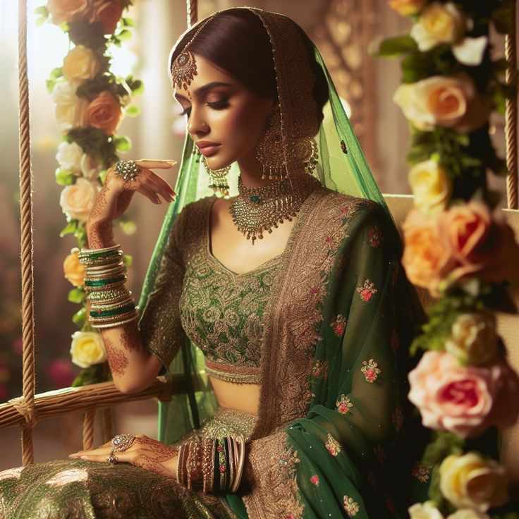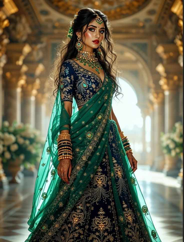 Siya stepped into the decorated royal hall with Divya, Daksh and Devika, her maroon lehenga now replaced by an emerald-green one, its golden embroidery glittering under the soft light. She wore matching jewelleries. Bangles jingled faintly as she walked, her shy smile lighting up her face while Her bindi glowed under the light like the moon.