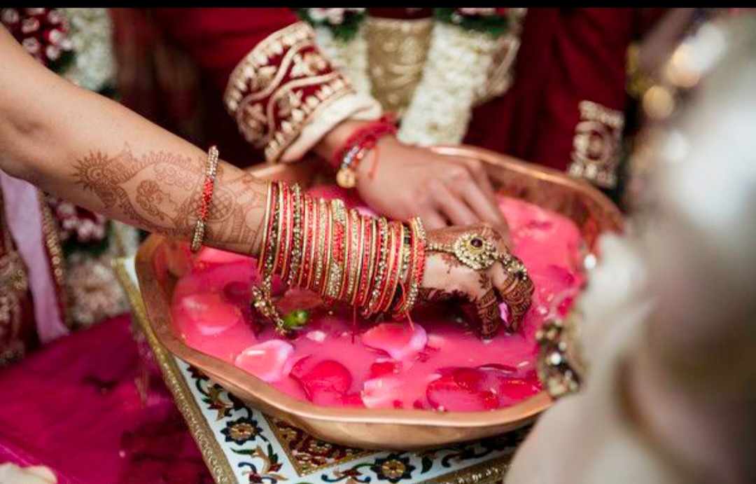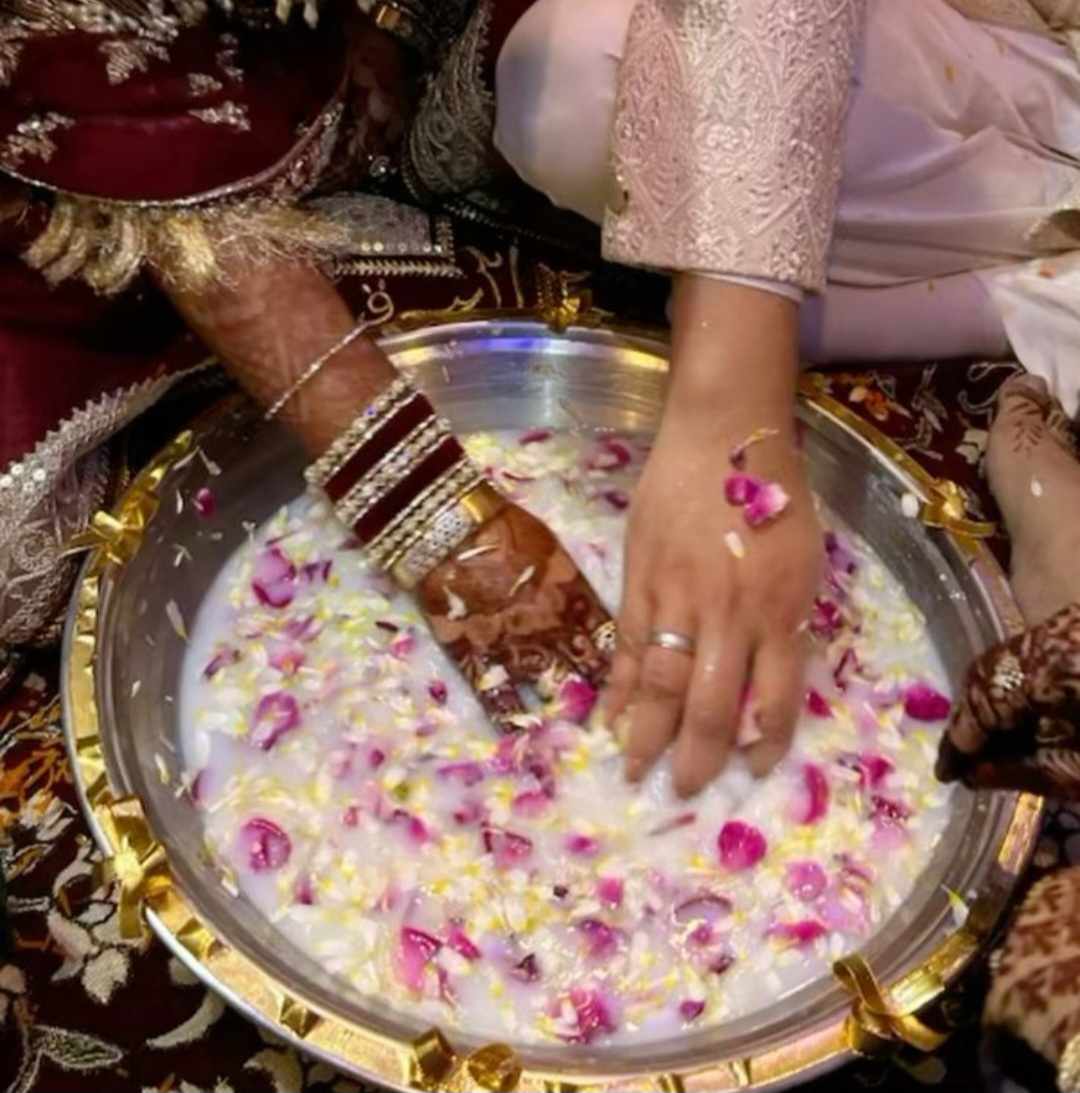At the center, there was a large thal filled with milk and decorated with rose petals. Two seats were arranged opposite each other one on either side of the thal.